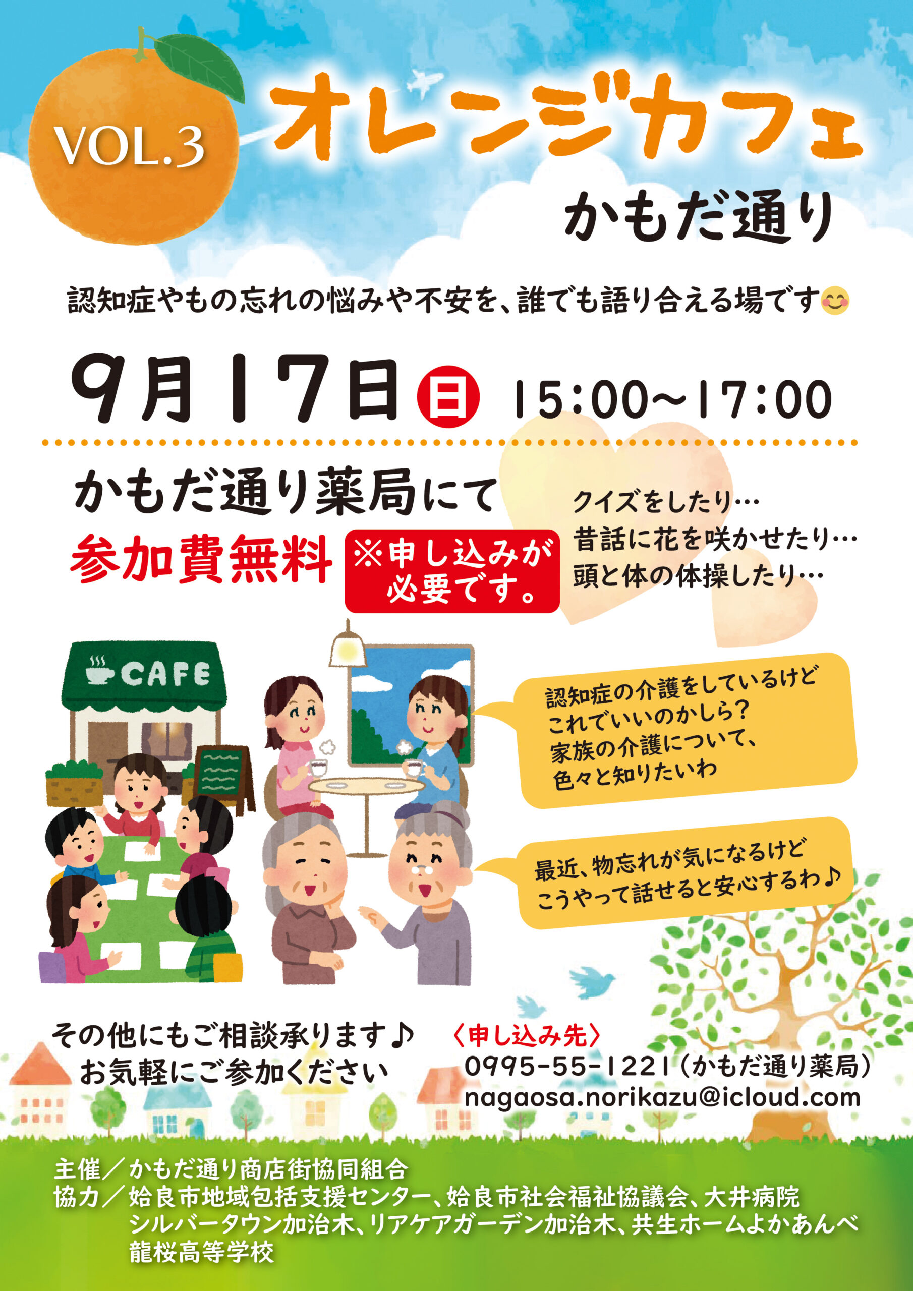 オレンジカフェを開催します! イベント Twitter Facebook はてブ Pocket LINE コピー 2023.09.16 かもだ通り薬局にで第3回オレンジカフェを開催します! お気軽にご参加ください!